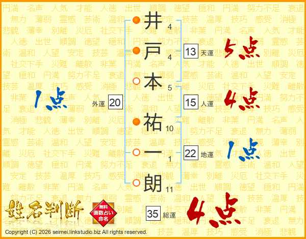 井(4画)戸(4画)本(5画) 祐(10画)一(1画)朗(11画)