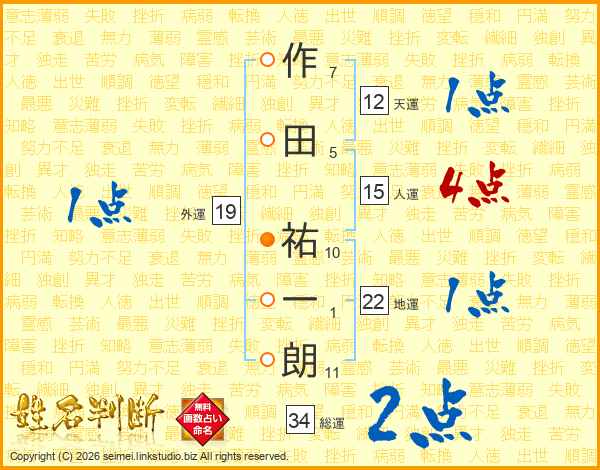 作(7画)田(5画) 祐(10画)一(1画)朗(11画)
