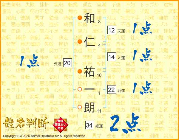 和(8画)仁(4画) 祐(10画)一(1画)朗(11画)