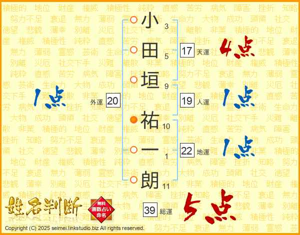 小(3画)田(5画)垣(9画) 祐(10画)一(1画)朗(11画)