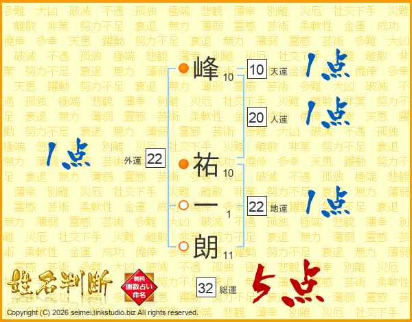 峰(10画) 祐(10画)一(1画)朗(11画)