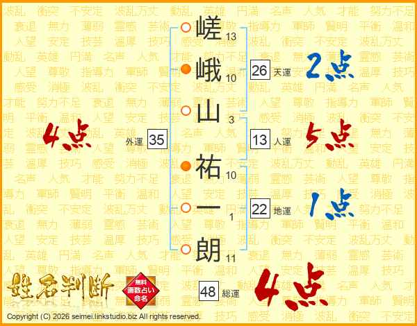 嵯(13画)峨(10画)山(3画) 祐(10画)一(1画)朗(11画)