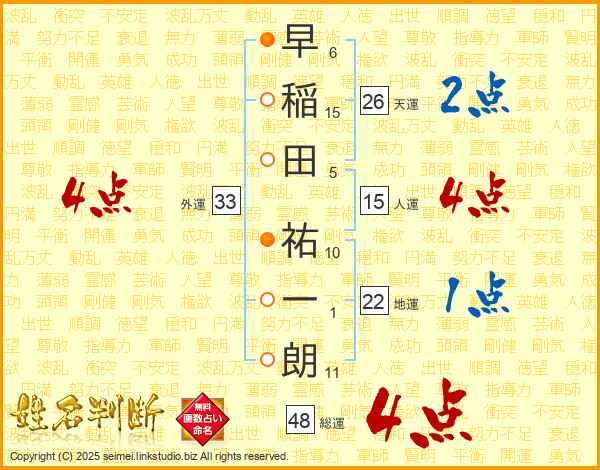 早(6画)稲(15画)田(5画) 祐(10画)一(1画)朗(11画)