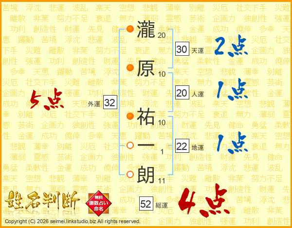瀧(20画)原(10画) 祐(10画)一(1画)朗(11画)