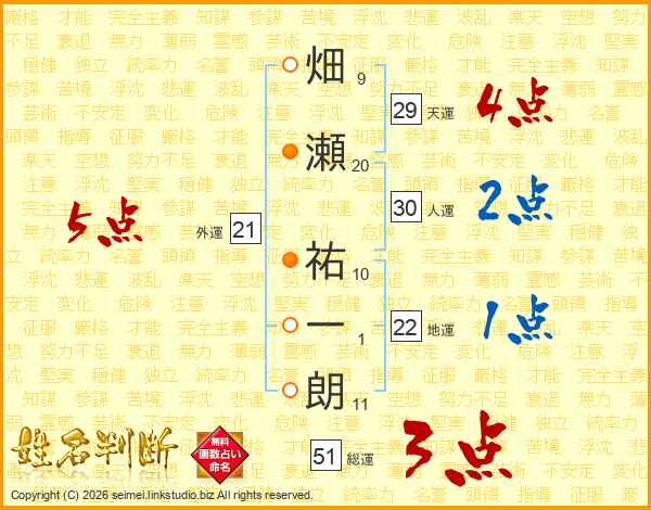 畑(9画)瀬(20画) 祐(10画)一(1画)朗(11画)