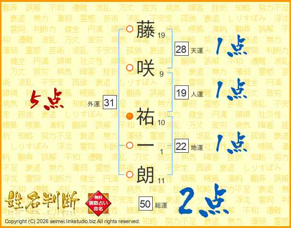 藤(19画)咲(9画) 祐(10画)一(1画)朗(11画)