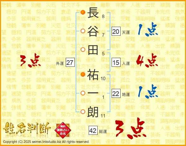 長(8画)谷(7画)田(5画) 祐(10画)一(1画)朗(11画)