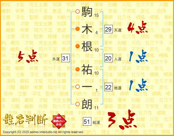 駒(15画)木(4画)根(10画) 祐(10画)一(1画)朗(11画)
