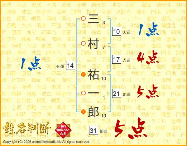 三村祐一郎さんの総運は31画の5点!