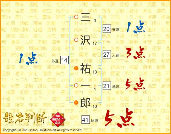 三(3画)沢(17画) 祐(10画)一(1画)郎(10画)