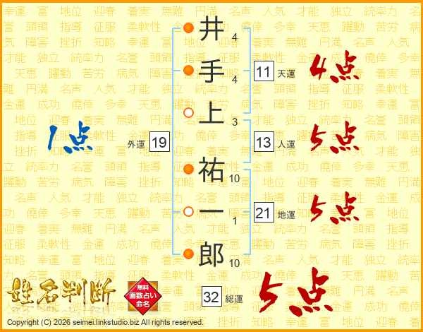 井(4画)手(4画)上(3画) 祐(10画)一(1画)郎(10画)