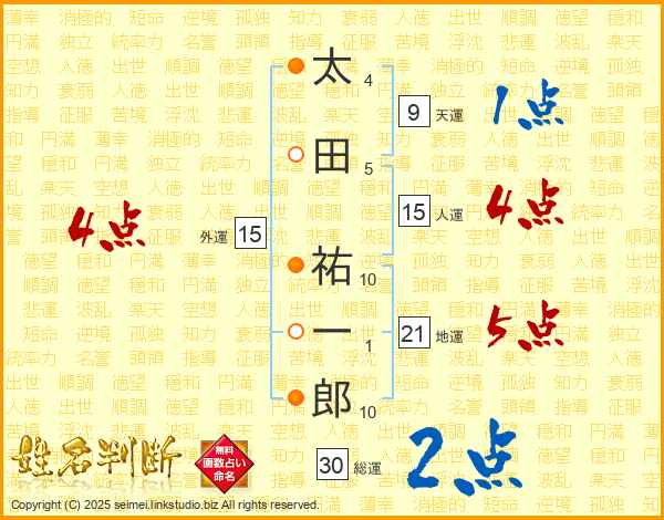 太(4画)田(5画) 祐(10画)一(1画)郎(10画)