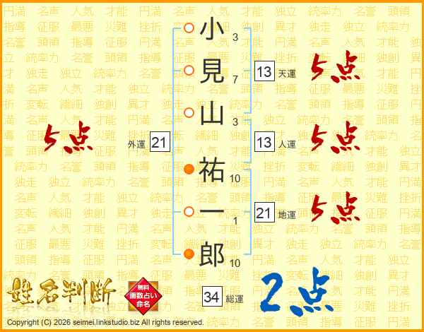小(3画)見(7画)山(3画) 祐(10画)一(1画)郎(10画)