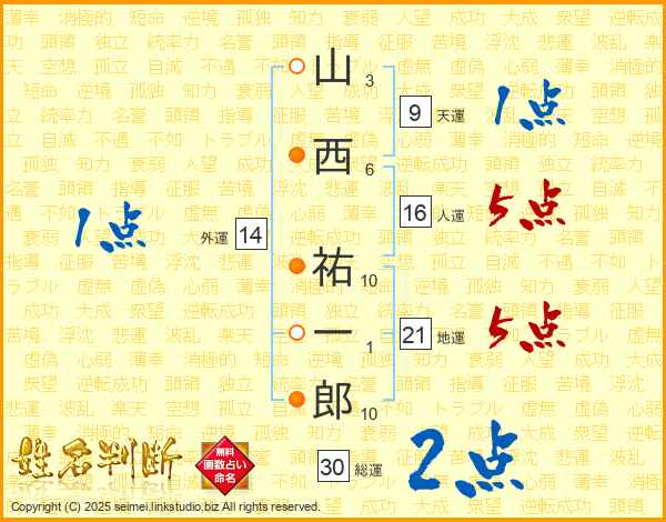 山(3画)西(6画) 祐(10画)一(1画)郎(10画)