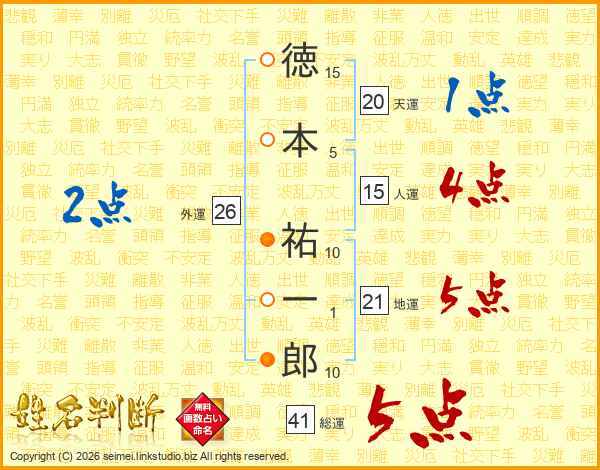 徳(15画)本(5画) 祐(10画)一(1画)郎(10画)