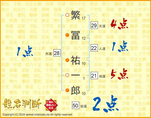 繁(17画)冨(12画) 祐(10画)一(1画)郎(10画)