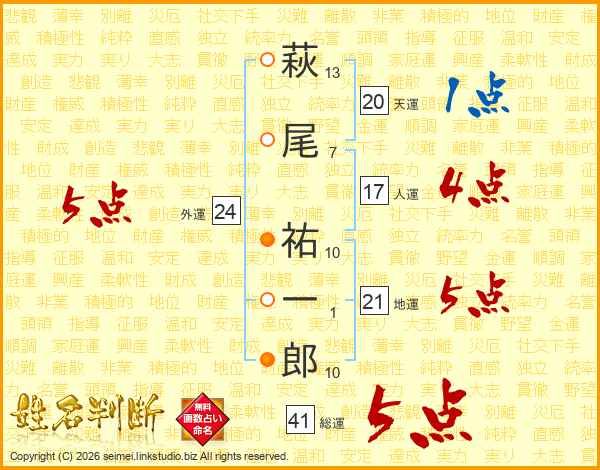 萩(13画)尾(7画) 祐(10画)一(1画)郎(10画)