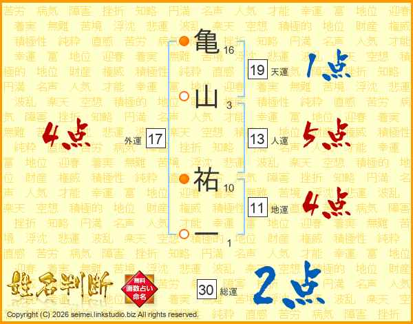 あなたの人生を表す1番重要な運勢です。生涯を通じて影響する総合運となり、主に50歳以降の晩年期に影響を及ぼします。苗字と名前の合計画数。