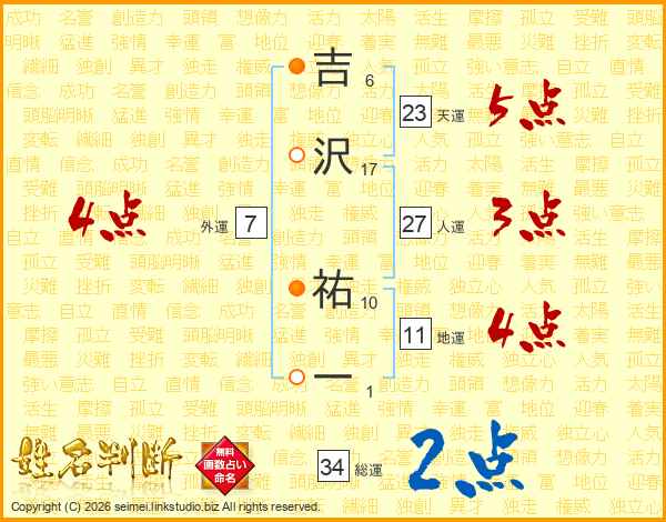 吉(6画)沢(17画) 祐(10画)一(1画)