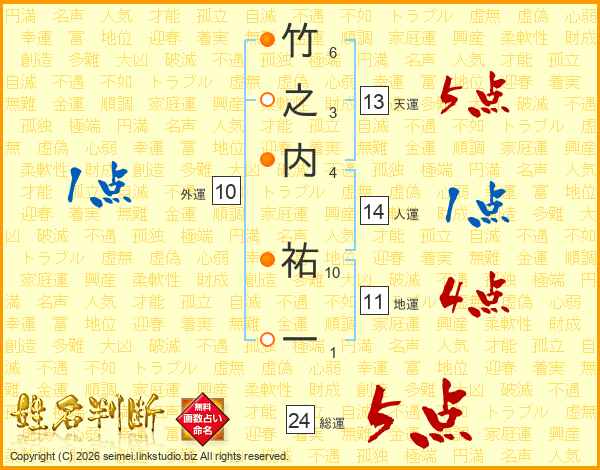 竹之内祐一さんの総運は24画の5点!