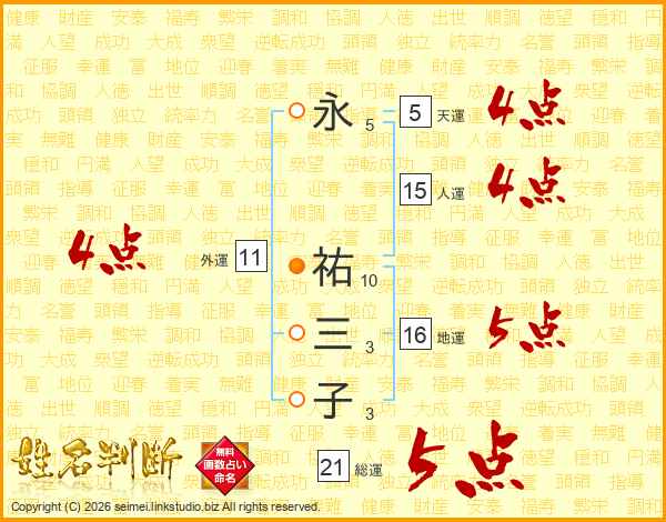 永(5画) 祐(10画)三(3画)子(3画)
