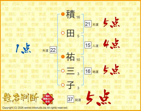 積(16画)田(5画) 祐(10画)三(3画)子(3画)