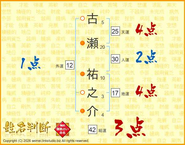 古(5画)瀬(20画) 祐(10画)之(3画)介(4画)