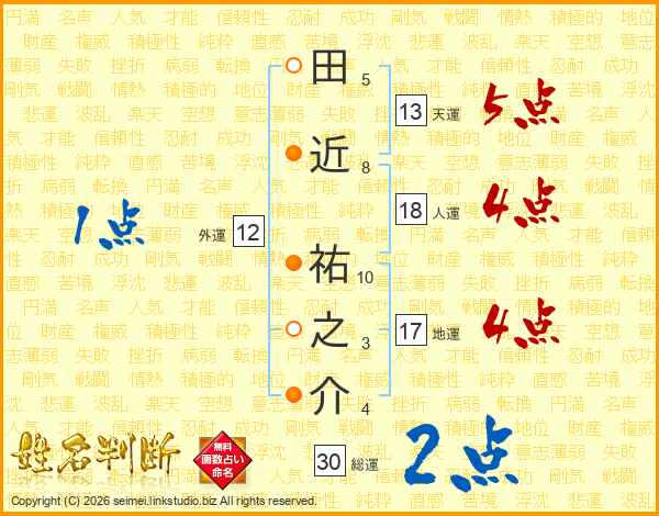 田(5画)近(8画) 祐(10画)之(3画)介(4画)