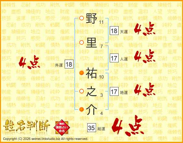 野(11画)里(7画) 祐(10画)之(3画)介(4画)