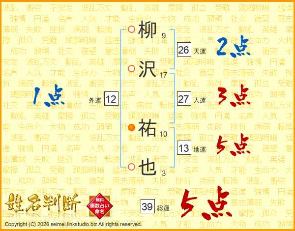 柳沢祐也さんの総運は39画の5点!