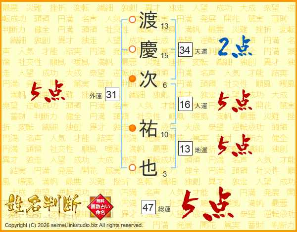 渡(13画)慶(15画)次(6画) 祐(10画)也(3画)