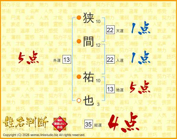 狭間祐也さんの総運は35画の4点!
