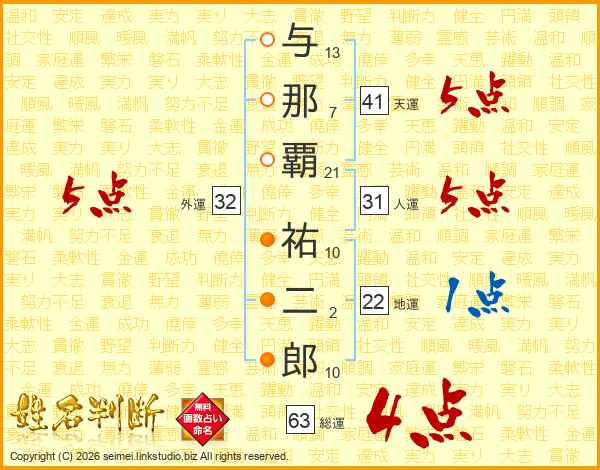 与(13画)那(7画)覇(21画) 祐(10画)二(2画)郎(10画)