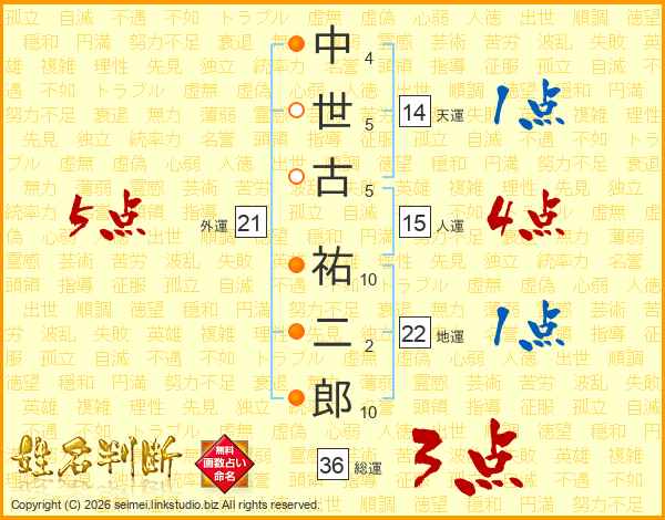 中(4画)世(5画)古(5画) 祐(10画)二(2画)郎(10画)