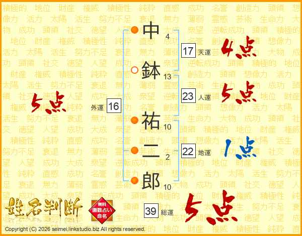 中鉢祐二郎さんの天運は17画の4点!