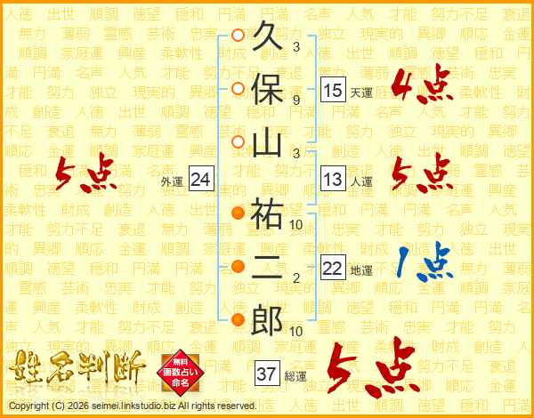 久(3画)保(9画)山(3画) 祐(10画)二(2画)郎(10画)