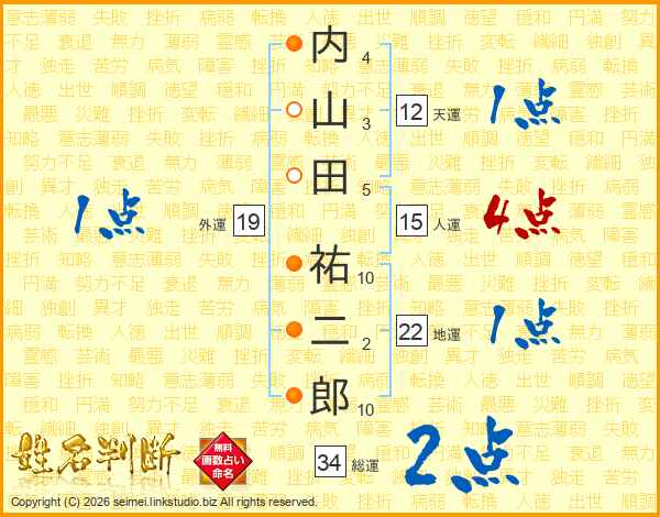 内(4画)山(3画)田(5画) 祐(10画)二(2画)郎(10画)