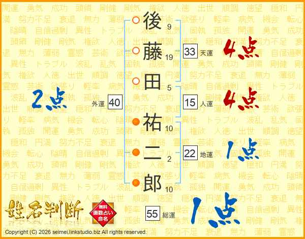 後(9画)藤(19画)田(5画) 祐(10画)二(2画)郎(10画)