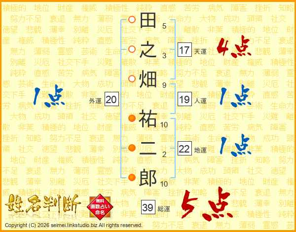 田(5画)之(3画)畑(9画) 祐(10画)二(2画)郎(10画)