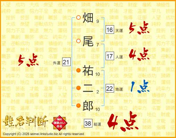 畑(9画)尾(7画) 祐(10画)二(2画)郎(10画)