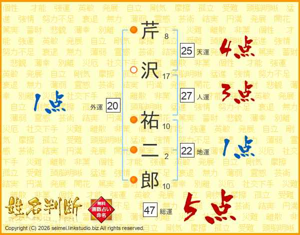 芹(8画)沢(17画) 祐(10画)二(2画)郎(10画)