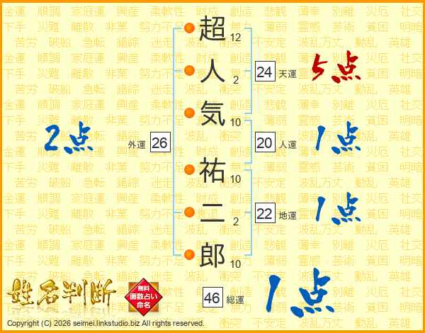 超(12画)人(2画)気(10画) 祐(10画)二(2画)郎(10画)
