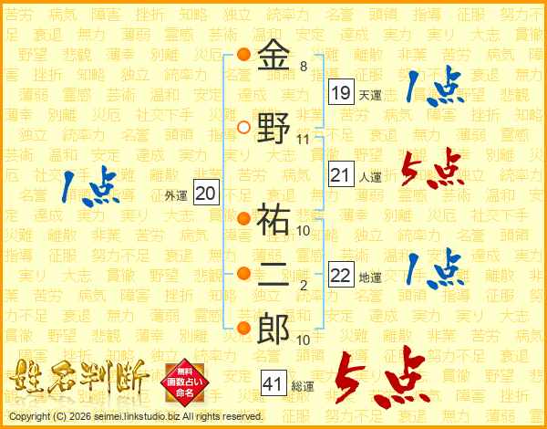 金(8画)野(11画) 祐(10画)二(2画)郎(10画)