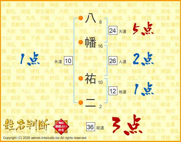 生活面を象徴する運勢です。外部から受ける影響力を表し、結婚運、家庭運や職場、環境への順応性を表します。総運から人運を引いた画数。姓や名が1文字の場合を除く。