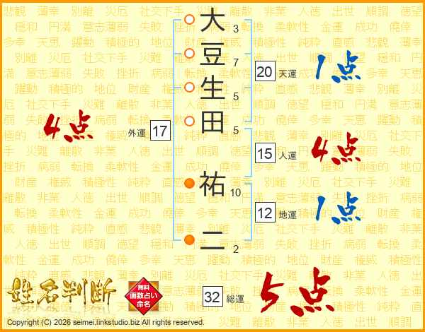 大豆生田祐二さんの総運は32画の5点!