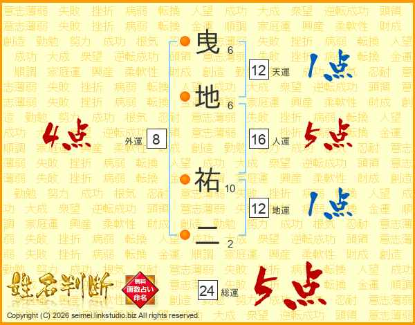 生活面を象徴する運勢です。外部から受ける影響力を表し、結婚運、家庭運や職場、環境への順応性を表します。総運から人運を引いた画数。姓や名が1文字の場合を除く。