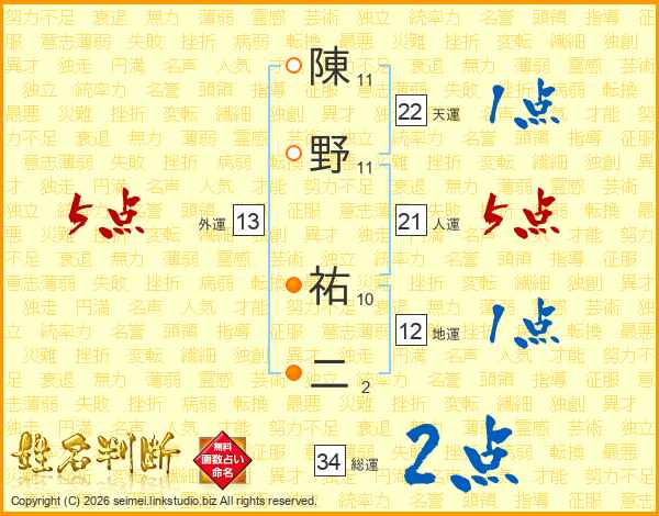 陳野祐二さんの人運は21画の5点!