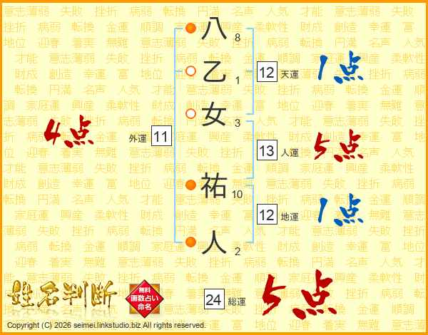 八(8画)乙(1画)女(3画) 祐(10画)人(2画)