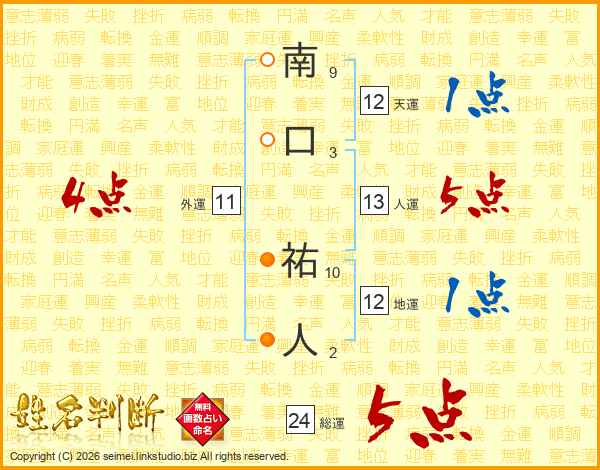 生活面を象徴する運勢です。外部から受ける影響力を表し、結婚運、家庭運や職場、環境への順応性を表します。総運から人運を引いた画数。姓や名が1文字の場合を除く。