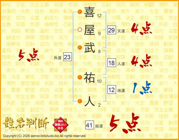 喜(12画)屋(9画)武(8画) 祐(10画)人(2画)